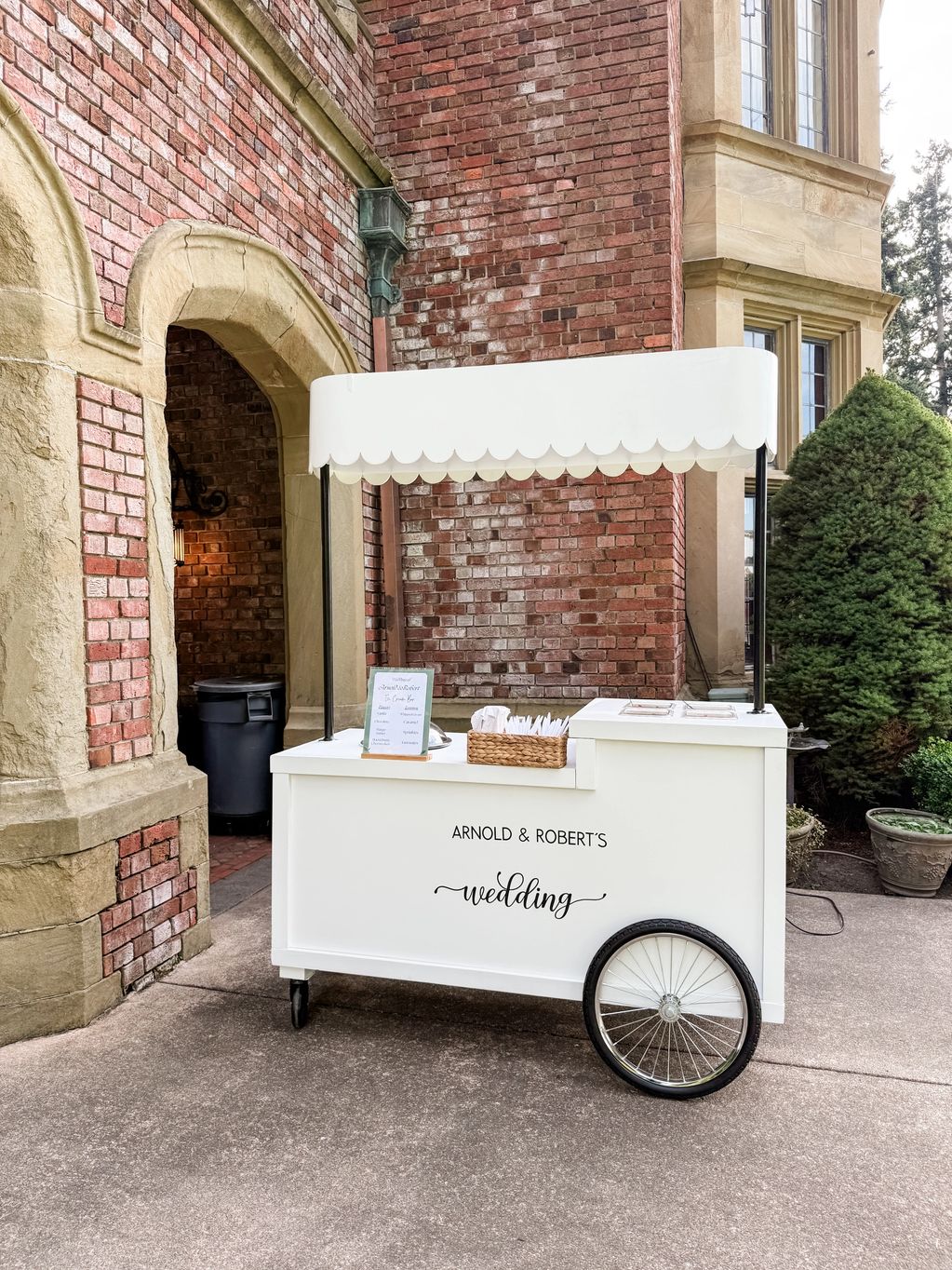 Our newest cart features stylish cycle-style wheels and a smooth white roof. This cart has quickly become a favorite for weddings, parties, and special events. It brings a fresh, clean look that fits beautifully with any theme.